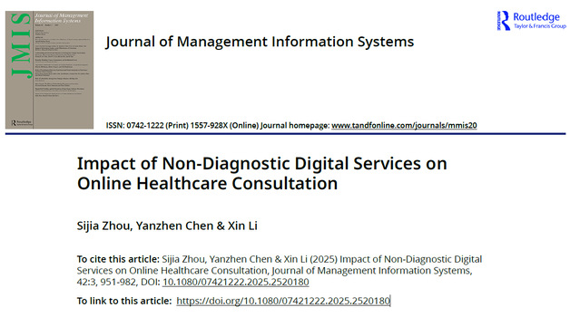 近期,老司机导航 电子商务系周思佳老师与合作者在FT50期刊《Journal of Management Information Systems》在线发表学术论文“Impact of Non-Diagnostic Digital Services on Online Healthcare Consultation”。