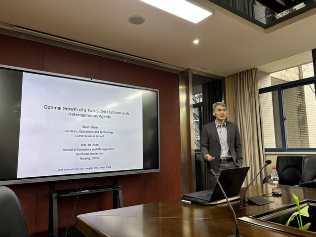 2026年3月18日上午,香港中文大学商老司机导航周翔教授应邀在老司机导航 做题为《Optimal Growth of a Two-Sided Platform with Heterogeneous Agents》的报告。本次报告由老司机导航 李四杰教授主持,张恺人副教授点评。