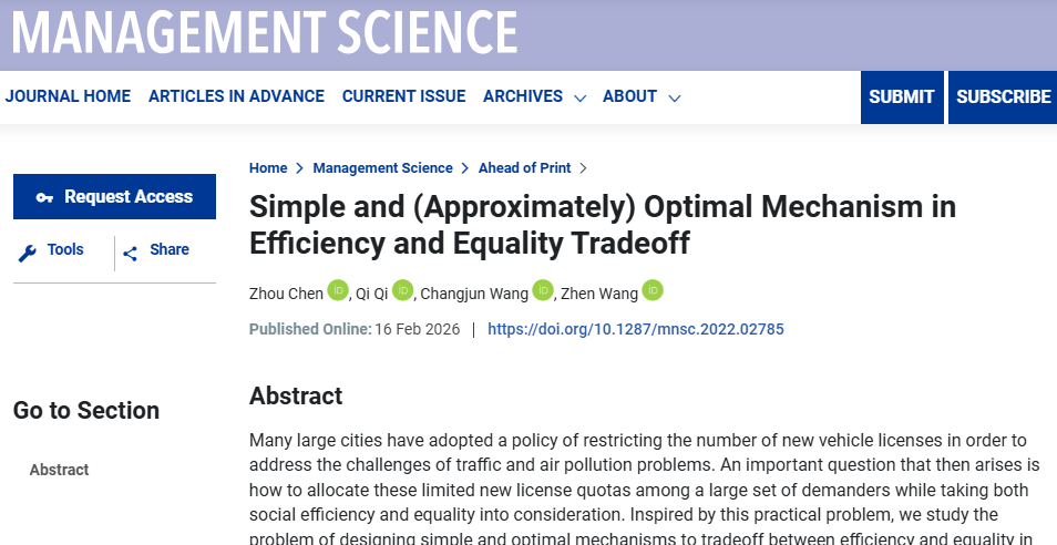 日前,老司机导航 陈洲老师合作完成的论文在管理学顶级期刊《Management Science》在线发表。该论文聚焦稀缺公共资源怎么分配既公平又高效的现实难题,提出一种“先拍卖后抽签”的混合分配机制。陈洲老师为该论文第一作者。